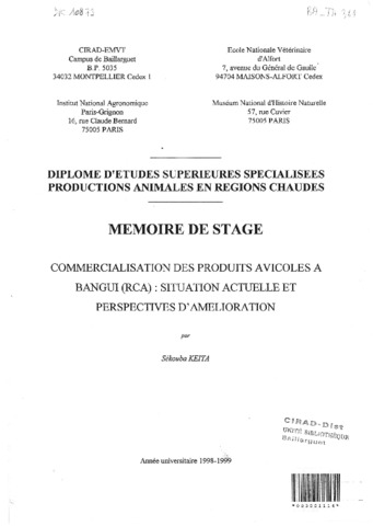 Keita Sékouba. 1999. Commercialisation des produits avicoles à Bangui (RCA) : situation actuelle et perpectives d'amélioration. Paris : MNHN, 107 p. Mémoire DESS : Productions animales en régions chaudes : Muséum national d'histoire naturelle