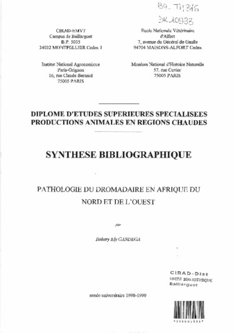 Gandega Bakary Ely. 1999. Pathologie du dromadaire en Afrique du nord et de l'ouest. s.l. : s.n., 36 p. Mémoire DESS (Synthèse bibliographique) : Productions animales en régions chaudes : Muséum national d'histoire naturelle