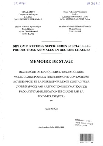 Le Bas Cédric. 1999. Recherche de marqueurs d'épidémiologie moléculaire pour la péripneumonie contagieuse bovine (PPCB) et la pleuropneumonie contagieuse caprine (PPCC) par restriction enzymatique de produits d'amplification en chaîne par la polymérase (PCR). Paris : MNHN, 89 p. Mémoire DESS : Productions animales en régions chaudes : Muséum national d'histoire naturelle