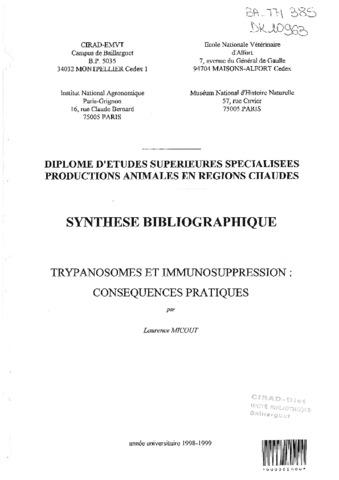 Micout Laurence. 1999. Trypanosomes et immunosuppression : conséquences pratiques. s.l. : s.n., 39 p. Mémoire DESS (Synthèse bibliographique) : Productions animales en régions chaudes : Muséum national d'histoire naturelle