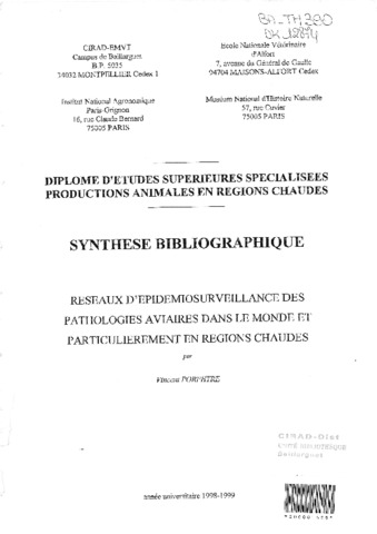 Porphyre Vincent. 1999. Réseaux d'épidémiosurveillance des pathologies aviaires dans le monde et particulièrement en régions chaudes. s.l. : s.n., 42 p. Mémoire DESS (Synthèse bibliographique) : Productions animales en régions chaudes : Muséum national d'histoire naturelle