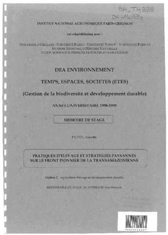 Fichtl Annette. 1999. Pratiques d'élevage et stratégies paysannes sur le front pionnier de la transamazonienne. Paris : INA-PG, 108 p. Mémoire DEA : Environnement, temps, espaces, sociétés (ETES) : Institut national agronomique Paris-Grignon
