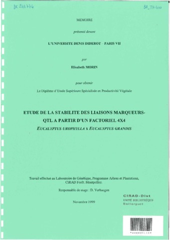 Morin Elisabeth. 1999. Etude de la stabilité des liaisons marqueurs-QTL à partir d'un factoriel 4X4 : Eucalyptus Urophylla x Eucalyptus Grandis. s.l. : s.n., 90 p. Mémoire DESS : Productivité Végétale : Université de Paris VII