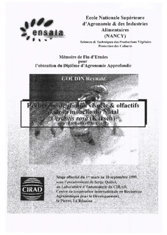 Goudin Reynald. 1999. Recherche de stimuli visuels et olfactifs pour la mouche du Natal Ceratitis rosa (Karsch) (Diptera : Tephritidae). Vandoeuvre-lès-Nancy : ENSAIA, 63 p. Mémoire DAA : Sciences et techniques des productions végétales. Protection des cultures : Ecole nationale supérieure d'agronomie et des industries alimentaires