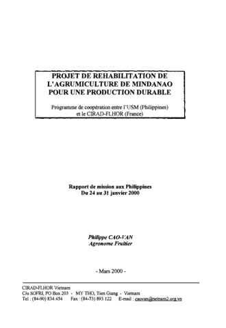 Cao Van Philippe. 2000. Projet de réhabilitation de l'agrumiculture de Mindanao pour une production durable. Programme de coopération entre l'USM (Philippines) et le CIRAD-FLHOR (France) : rapport de mission aux Philippines du 24 au 31 janvier 2000. Vietnam : CIRAD-FLHOR, 51 p.