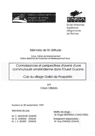 Cibulka Chloé. 1999. Connaissances et perspectives d'avenir d'une communauté amérindienne dans l'Ouest Guyane : cas du village Galibi de Prospérité. Rennes : ENSAR, 145 p. Mémoire de fin d'études : Génie de l'environnement option systèmes de production et développement rural : Ecole nationale supérieure agronomique de Rennes