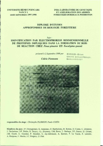 Pionneau Cédric. 1998. Identification par électrophorèse bidimensionnelle de proteines impliquées dans la formation du bois de réaction chez Pinus pinates et Eucalyptus gunnii. Nancy : Université de Nancy I, 70 p. Mémoire DEA : Biologie forestière : Université de Nancy I