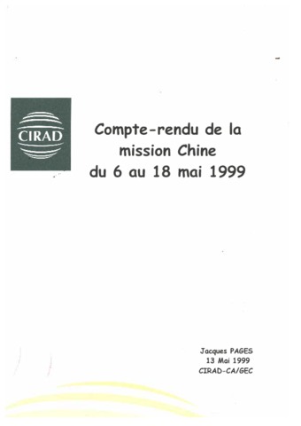 Pagès Jacques. 1999. Compte-rendu de la mission Chine du 6 au 18 mai 1999. Montpellier : CIRAD-CA, 22 p.