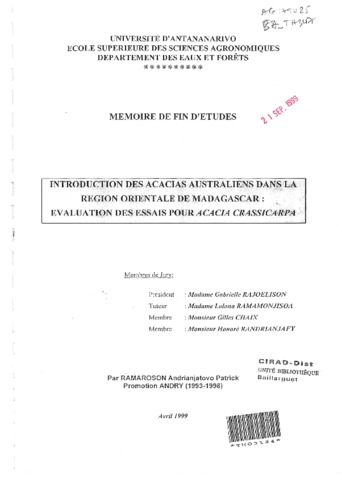 Ramaroson A.P.. 1999. Introduction des acacias australiens dans la région orientale de Madagascar : évaluation des essais pour Acacia crassicarpa. s.l. : s.n., 101 p. Mémoire de fin d'études : Ecole supérieure des sciences agronomiques