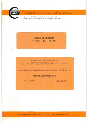 Renard Jean-Luc. 1992. Mécanismes des réactions de défense du palmier à huile vis-à-vis du Fusarium oxysporum f. sp. elaeidis. Etudes cytologiques et analyses biochimiques : application au renforcement des critères de sélection. Rapport semestriel n.4 (février 1992). Contrat de recherche n.TS2A-0261-M (CD). Montpellier : CIRAD-IRHO, 114 p. N° de rapport : CIRAD-IRHO Doc n°2415