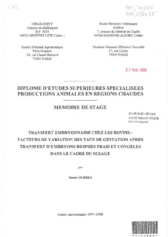 Oubbea S.. 1998. Transfert embryonnaire chez les bovins : facteurs de variation des taux de gestation après transfert d'embryons biopsiés frais et congelés dans le cadre du sexage. Montpellier : CIRAD-EMVT, 71 p. Mémoire DESS : Productions Animales en Régions Chaudes : Ecole nationale vétérinaire d'Alfort