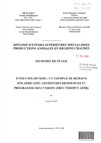Alary F.. 1998. Tussen-Die-Riviere : un exemple de réserve Sud-africaine. Gestion des ressources et programme oryctérope (Orycteropus afer). Montpellier : CIRAD-EMVT, 87 p. Mémoire DESS : Productions Animales en Régions Chaudes : Ecole nationale vétérinaire d'Alfort