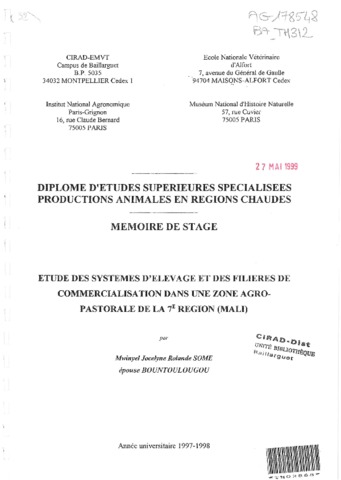 Somé Bountoulougou M.J.R.. 1998. Etude des systèmes d'élevage et des filières de commercialisation dans une zone agro-pastorale de la 7e région (Mali). Montpellier : CIRAD-EMVT, 119 p. Mémoire DESS : Productions Animales en Régions Chaudes : Ecole nationale vétérinaire d'Alfort