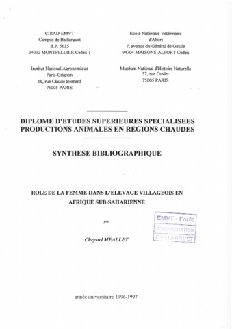Meallet C.. 1997. Rôle de la femme dans l'élevage villageois en Afrique sub-Saharienne. Montpellier : CIRAD-EMVT, 30 p. Mémoire DESS (Synthèse bibliographique) : Productions Animales en Régions Chaudes : Ecole nationale vétérinaire d'Alfort