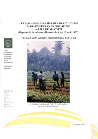 Girard Jean-Claude. 1997. Les maladies parasitaires des cultures maraîchères en saison sèche à l'île de Mayotte. (Rapport de la mission effectuée du 4 au 10 août 1997). Saint-Denis : CIRAD-CA, 28 p.