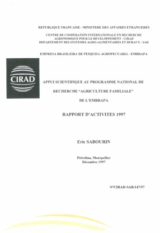 Sabourin Eric. 1997. Appui scientifique au programme national de recherche agriculture familiale de l'EMBRAPA. Rapport d'activités 1997. Montpellier : CIRAD-SAR, 30 p. N° de rapport : CIRAD-SAR N°147/97