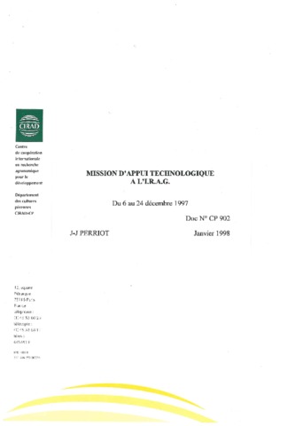 Perriot Jean-Jacques. 1998. Mission d'appui technologique à l'IRAG du 6 au 24 décembre 1997. Montpellier : CIRAD-CP, 60 p. N° de rapport : CP_SIC 902