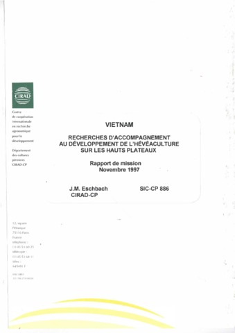 Eschbach Jean-Marie. 1997. Vietnam. Recherches d'accompagnement au développement de l'hévéaculture sur les Hauts Plateaux. Rapport de mission, novembre 1997. Montpellier : CIRAD-CP, 94 p. N° de rapport : CP_SIC 886
