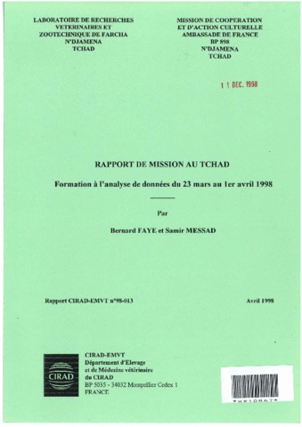 Faye Bernard, Messad Samir. 1998. Rapport de mission au Tchad. Formation à l'analyse de données du 23 mars au 1er avril 1998. Montpellier : CIRAD-EMVT, 103 p.