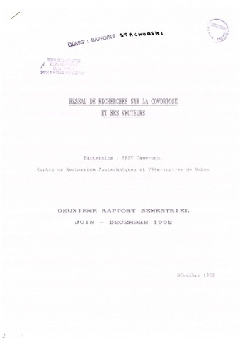 Mbah D.A., Stachurski Frédéric. 1992. Réseau de recherches sur la cowdriose et ses vecteurs. Deuxième rapport semestriel (juillet-décembre 1992. Partenaire IRZV Cameroun). Wakwa : CRZV, 11 p.