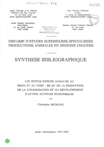 Medenou C.. 1992. Les petites espèces animales au Bénin et au Togo : Bilan de la production, de la consommation et du développement d'autres activités économiques. Maisons-Alfort : CIRAD-IEMVT, 38 p. Mémoire DESS (Synthèse bibliographique) : Productions Animales en Régions Chaudes : Ecole nationale vétérinaire d'Alfort