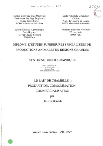 Khelili H.. 1992. Le lait de chamelle : production, consommation, commercialisation. Maisons-Alfort : CIRAD-IEMVT, 36 p. Mémoire DESS (Synthèse bibliographique) : Productions Animales en Régions Chaudes : Ecole nationale vétérinaire d'Alfort