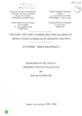 Maibeche M.. 1992. Phéromones de tiques : perspectives d'utilisation. Maisons-Alfort : CIRAD-IEMVT, 29 p. Mémoire DESS (Synthèse bibliographique) : Productions Animales en Régions Chaudes : Ecole nationale vétérinaire d'Alfort
