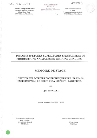 Autre titre : Zootechnical management of datas from the experimental deer farm of Port-Laguerre