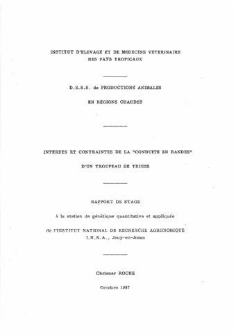 Roche C.. 1987. Intérêts et contraintes de la "conduite en bandes" d'un troupeau de truies. Maisons-Alfort : CIRAD-IEMVT, 102 p. Mémoire DESS : Productions Animales en Régions Chaudes : Université de Paris-Val-de-Marne