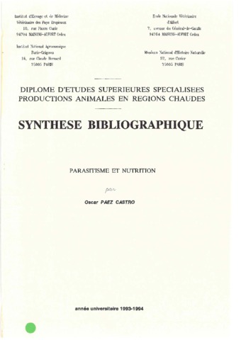 Castro O.P.. 1993. Parasitisme et nutrition. Maisons-Alfort : CIRAD-EMVT, 27 p. Mémoire DESS (Synthèse bibliographique) : Productions Animales en Régions Chaudes : Ecole nationale vétérinaire d'Alfort