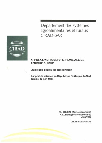Bonnal Philippe, Kleene Paul. 1996. Appui à l'agriculture familiale en Afrique du Sud : quelques pistes de coopération. Rapport de mission en République d'Afrique du Sud du 3 au 12 juin 1996. Montpellier : CIRAD-SAR, 31 p. N° de rapport : CIRAD-SAR N°107/96
