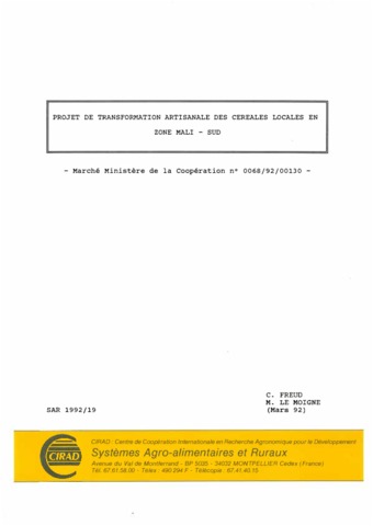 Freud Claude, Le Moigne Marc. 1992. Projet de transformation artisanale des céréales locales en zone Mali Sud. Marché Ministère de la Coopération n° 0068/92/00130. Montpellier : CIRAD-SAR, 97 p.