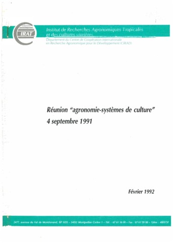 CIRAD-IRAT - REU. 1992. Réunion "Agronomie-Systèmes de Culture" 4 Septembre 1991. Montpellier : CIRAD-IRAT, 105 p. Agronomie _ systèmes de culture, Montpellier, France, 4 Septembre 1991.