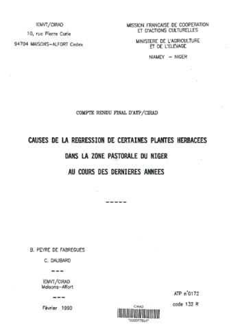 Peyre De Fabrègues Bernard, Dalibard C.. 1990. Causes de la régression de certaines plantes herbacées dans la zone pastorale du Niger au cours des dernières années : compte-rendu final d'ATP/CIRAD. Maisons-Alfort : CIRAD-IEMVT, 151 p.