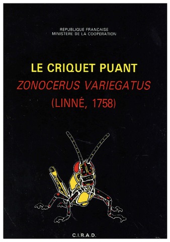 Chiffaud Joëlle, Mestre Jacques. 1990. Le criquet puant Zonocerus variegatus (Linné, 1758) : essai de synthèse bibliographique. Montpellier : CIRAD-PRIFAS, 140 p. ISBN 2-87614-034-9