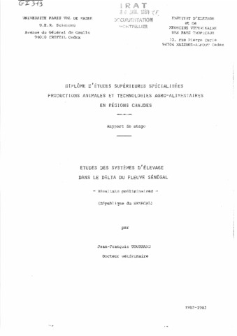Tourrand Jean-François. 1983. Etudes des systèmes d'élevage dans le delta du fleuve Sénégal. Résultats préliminaires (République du Sénégal). Maisons-Alfort : GERDAT-IEMVT, 114 p. Mémoire DESS : Productions Animales et Technologies Agro-Alimentaires en Régions Chaudes : Université de Paris-Val-de-Marne
