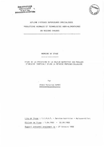 Ahmed A.M.. 1983. Etude de la prevision de la valeur nutritive des pailles d'origine tropicale selon la methode pepsine-cellulase. Maisons-Alfort : GERDAT-IEMVT, 64 p. Mémoire DESS : Productions Animales en Régions Chaudes : Université de Paris-Val-de-Marne