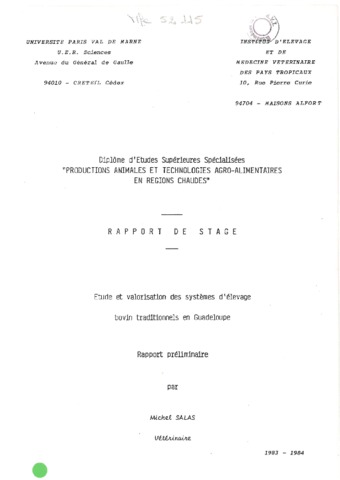 Salas Michel. 1984. Etude et valorisation des systèmes d'élevage bovin traditionnels en Guadeloupe. Rapport préliminaire. Maisons-Alfort : GERDAT-IEMVT, 108 p. Mémoire DESS : Productions Animales en Régions Chaudes : Université de Paris-Val-de-Marne