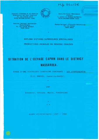 Poudevigne F.. 1988. Situation de l'élevage caprin dans le district de Massaroca, étude d'une contrainte sanitaire dominante : les avortements (N.E. Brésil, Juazeiro-Bahia). Maisons-Alfort : CIRAD-IEMVT, 80 p. Mémoire DESS : Productions Animales en Régions Chaudes : Université de Paris-Val-de-Marne