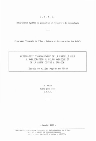Valet Serge. 1985. Action-test d'aménagement de la parcelle pour l'amélioration du bilan hydrique et de la lutte contre l'érosion. (essai en milieu paysan en 1984). Montpellier : CIRAD-IRAT, 116 p.