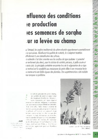 Luce Claude. 1994. Influence des conditions de production des semences de sorgho sur la levée au champ. Agriculture et Développement (1) : 43-46.