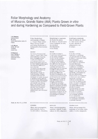 Titre anglais : Foliar morphology and anatomy of Musa cv. Grande naine (AAA) plants grown in vitro and during hardening as compared to field-grown plants / Titre anglais : Morfologia y anatomia foliar de plantas de Musa cv. Gran enano (AAA) in vitro, durante la aclimatacion y en el campo