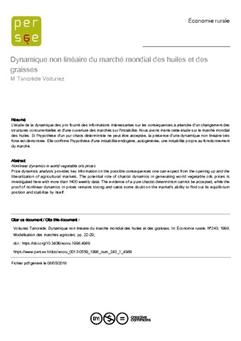 Voituriez Tancrède. 1998. Dynamique non linéaire du marché mondial des huiles et des graisses. Economie Rurale (243) : 22-27.