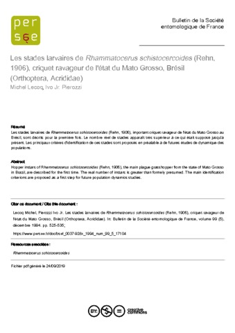 Lecoq Michel, Pierozzi I.. 1994. Les stades larvaires de Rhammatocerus schistocercoides (Rehn, 1906), criquet ravageur de l'état du Mato Grosso, Brésil (Orthoptera, Acrididae). Bulletin de la Société Entomologique de France, 99 (5) : 525-535.