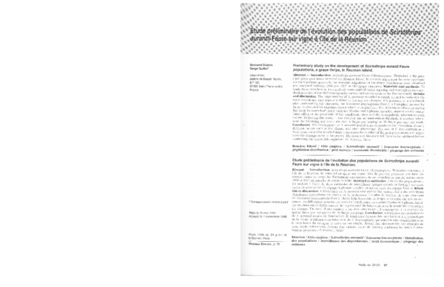 Titre anglais : Preliminary study on the development of Scirtothrips auranti Faure populations, a grape thrips, in Reunion Island / Titre français : Estudio previo de la evolucion de las poblaciones de Scirtothrips auranti Faure en vina en la isla de la Reunion