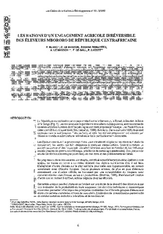 Blanc F., Le Masson C., Ramayeko Assana, Le Masson Alain, Le Gall François, Lhoste Philippe. 1992. Eleveurs Mbororo de République Centrafricaine : les raisons d'un engagement agricole irréversible. Cahiers de la Recherche-Développement (32) : 6-18.