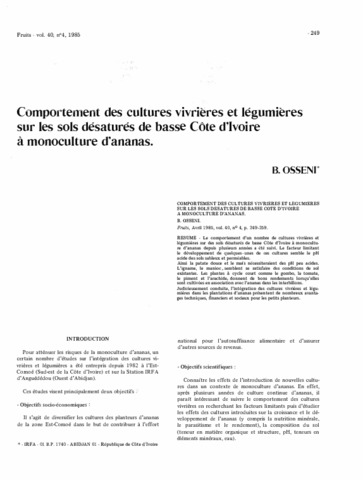 Titre anglais : Behaviour of food and vegetable crops in the desatured earths of the lower Ivory Coast to pineapple monoculture