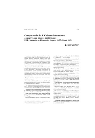 Dupaigne P.. 1978. Compte-rendu du 4 ème Colloque International consacré aux Plantes Medicinales. UER, médecine et pharmacie, Angers, 26-27-28 mai 1978. Fruits, 33 (5) : 363-365.