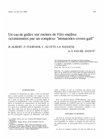 Aubert Bernard, Fournier Patrick, Scotto La Massese C., Faivre Amyot A.. 1983. Un cas de galles sur racines de Vitis vinifera occasionnées par un complexe "nématodes-crown gall". Fruits, 38 (12) : 827-830.