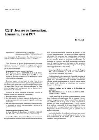 Huet Raymond. 1977. XXIIe journée de l'aromatique. Fruits, 32 (5) : 362-364. Journée de l'aromatique. 12, Lourmarin, France, 7 Mai 1977.